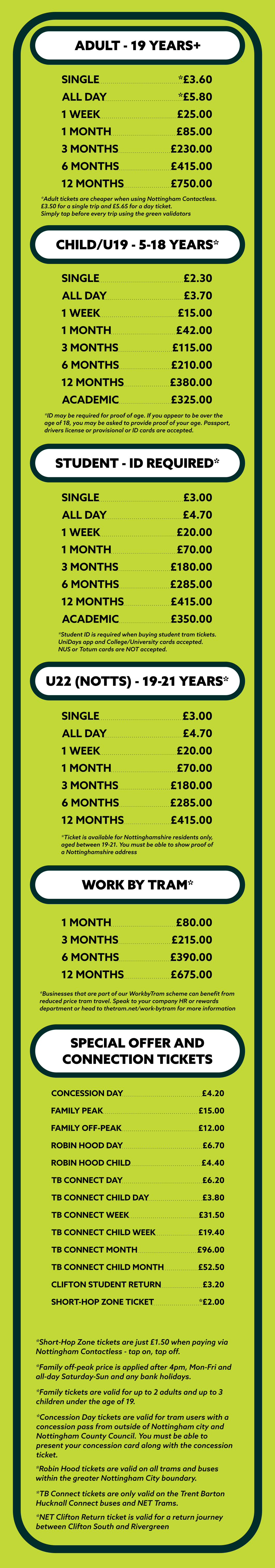 Season pass tickets covering both buses and trams are also available. For more information and the latest prices, please click the following link: https://robinhoodnetwork.co.uk/card/season-cards/