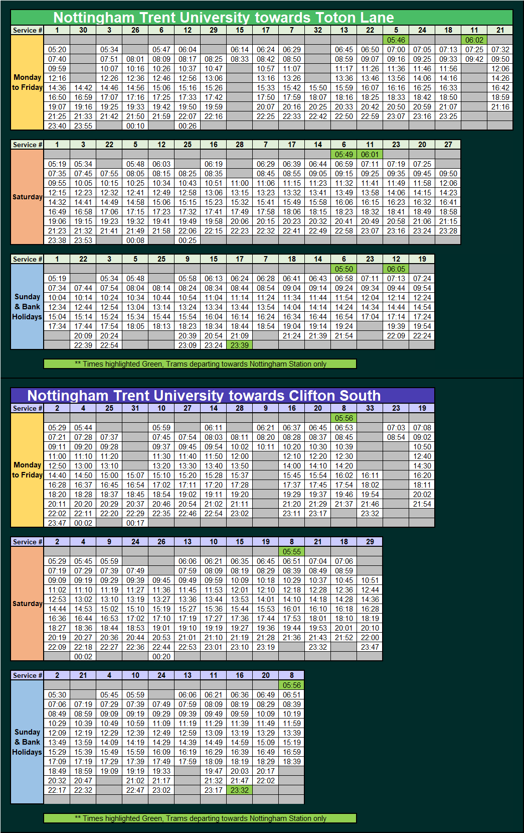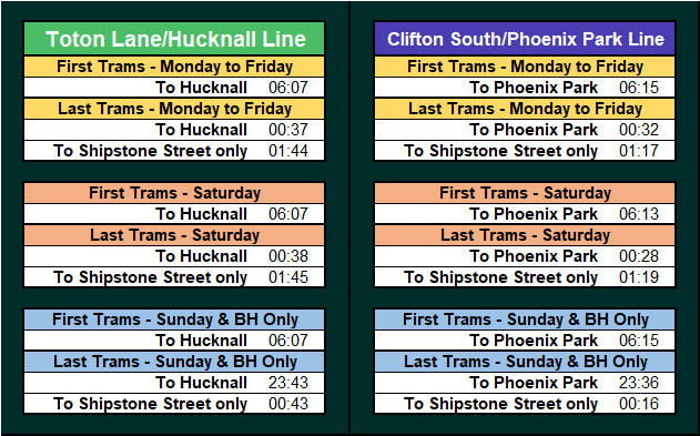- Departure times, Journey times, First & Last trams.